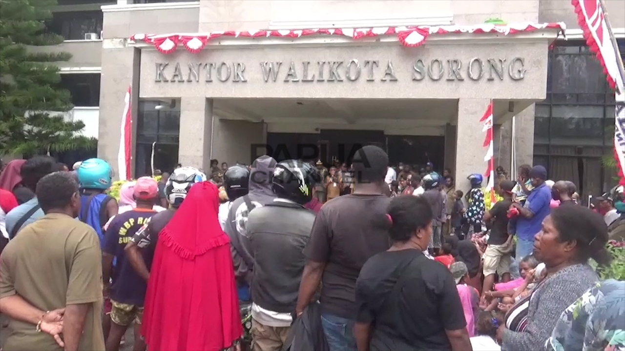 Pedagang pasar modern Kota Sorong berdemonstrasi di halaman kantor wali kota setempat, Selasa (30/08/22).