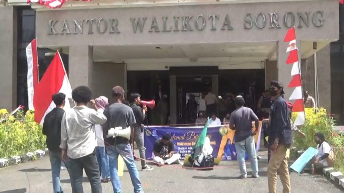 Dengan berjalan kaki dari depan bandara DEO, pengunjuk rasa dikawal ketat polisi hingga memasuki halaman kantor Wali Kota Sorong untuk menyampaikan aspirasinya.
