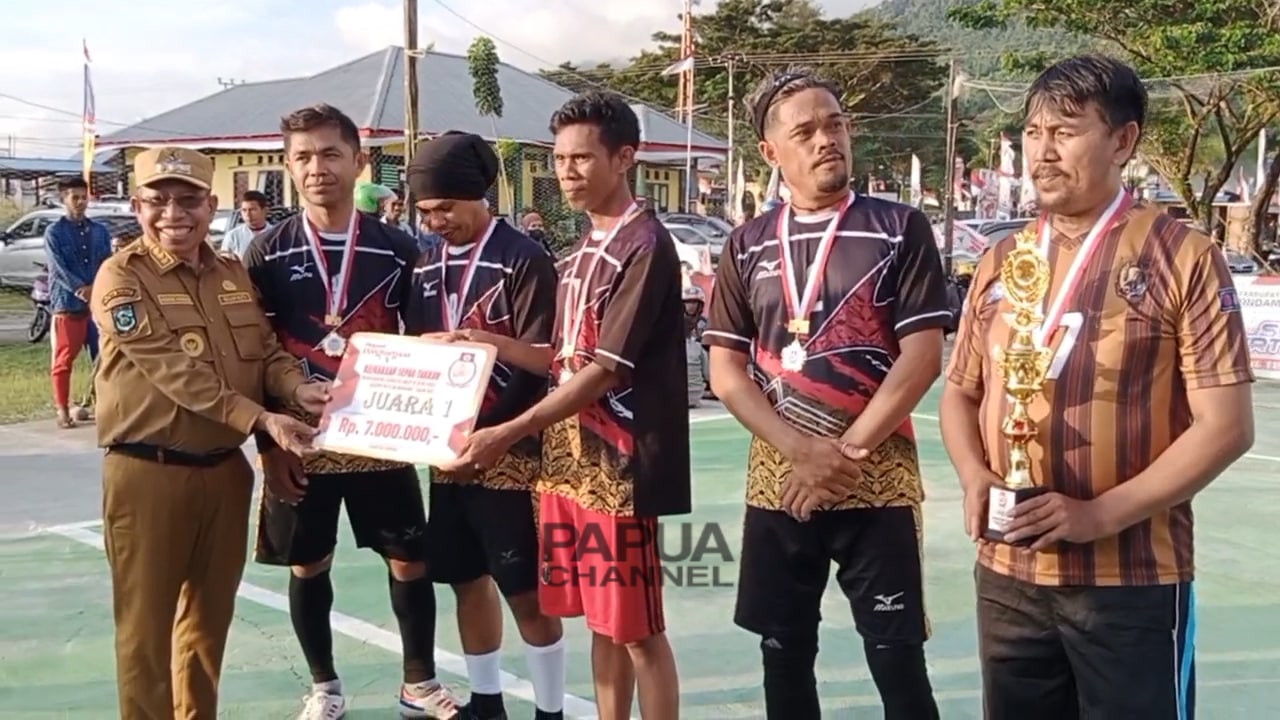 Penyerahan piala medali dan uang pembinaan kepada Juara-I, Tim Takrauw Siompu-A dilakukan oleh Bupati Teluk Wondama, Hendrik Syake Mambor. (*red)