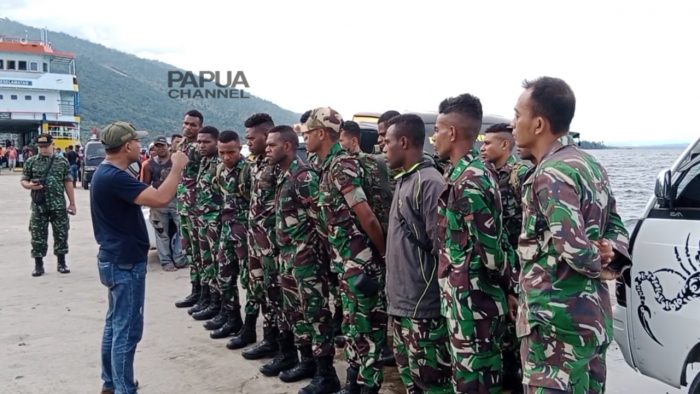 Puluhan prajurit T-N-I tiba di pelabuhan Kuri Pasai, Wasior, kabupaten Teluk Wondama, Papua Barat, Rabu 14 September 2022.